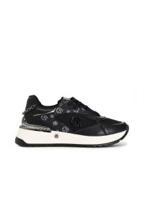 Sneakers with running sole customised with a logo on the side, upper in mesh fabric and leather with patent leather inserts. A small chain decorates the back while the side is embellished with a metal logo.