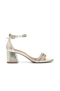 Metallic effect sandals with rhinestones. reinforced heel in the back. medium heels. adjustable ankle strap and buckle.