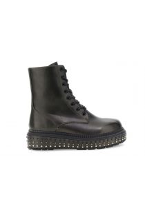 Lace-up ankle boots in brushed metallic faux leather with a leather insole and platform sole decorated with gold and black studs. 3.5 mm sole height. Bold and contemporary style.