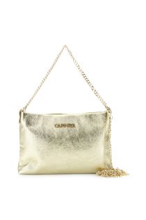 metallic leather clutch bag, shoulder strap and handle with chain and snap hooks gold
