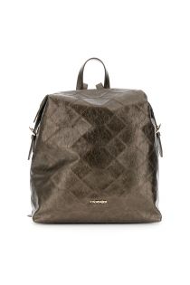 Soft metallic faux leather backpack with geometric embroidery on the front, adjustable shoulder straps, flat back pocket, and square buckles. Elegant metal lettering.