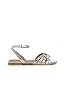 Laminated leather low sandals with ankle strap and front decoration resembling interwoven leaves.