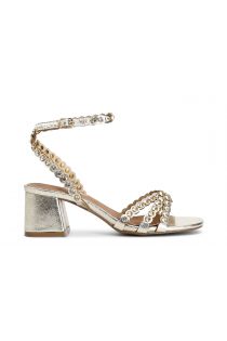 Metallic effect sandals with rhinestones. medium heels. adjustable ankle strap and buckle.