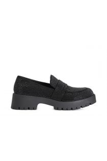 Women's microfibre loafer. upper covered with micro-rhinestones. rubber lug sole and 40mm heel.