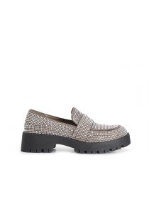 Women's microfibre loafer. upper covered with micro-rhinestones. rubber lug sole and 40mm heel.