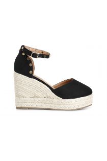 Microfibre sandals on 10.5 cm rope wedge and 3.5 cm platform. ankle strap. leather insole. shoe closed at the front and back. golden studs on the top and on the strap.