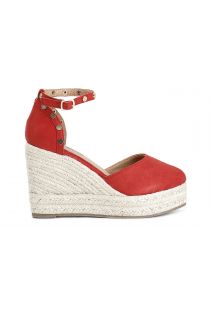 Microfibre sandals on 10.5 cm rope wedge and 3.5 cm platform. ankle strap. leather insole. shoe closed at the front and back. golden studs on the top and on the strap.