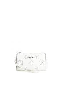 Wallet with fold and double zip and pod opening micro-perforated logo pattern with wrist strap.