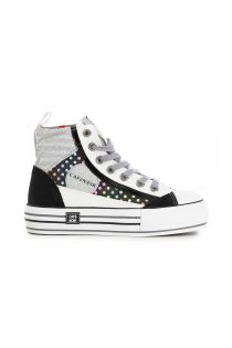 Mid sneakers made of a patchwork of fabrics in shades of grey and black. rubber sole with inserts matching the upper and logo.
