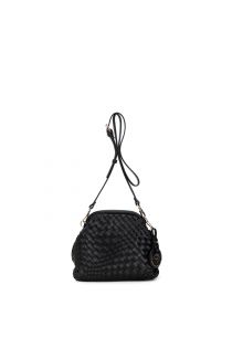 Mini bag embellished by irregular sized crossover feature and tubular handles. Custom pendant accessory