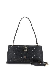 Faux leather mini shoulder bag with micro studs and a decorative buckle pendant. Complete with a removable shoulder strap for a versatile and refined style.