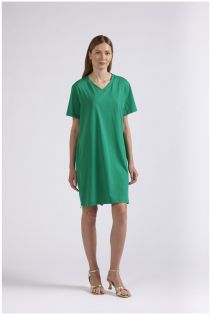 Dual-material mini dress with cotton jersey front and broderie anglaise back. v neckline and short sleeves. comfortable fit.