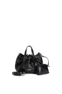 Soft unlined handbag with metal bar for elegant folds decorative laces removable internal clutch bag magnetic closure and adjustable shoulder strap.