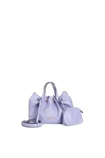 Soft unlined handbag with metal bar for elegant folds decorative laces removable internal clutch bag magnetic closure and adjustable shoulder strap.
