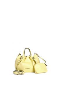 Soft unlined handbag with metal bar for elegant folds decorative laces removable internal clutch bag magnetic closure and adjustable shoulder strap.
