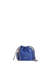 minibag with drawstring closure and chain shoulder strap with elegant threads blue