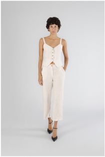 Elegant straight leg trousers with fixed turn-up at the bottom. model made of pinstriped linen fabric. perfect to wear with its matching jacket.