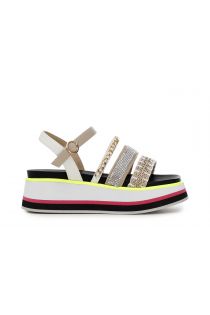 Multi-strap sandals with chain and micro rhinestones, sole in colourful micro multi-layer and comfortable fussbett.