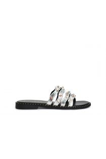 Multi-listed slipper with cabochon. lining and insole are in leather. the heel is 2 cm high. comfortable to wear and easy to match.