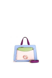Rigid multicoloured hand-held tote with enamelled oval logo accessory. removable pocket. zip closure. bag with shoulder strap.