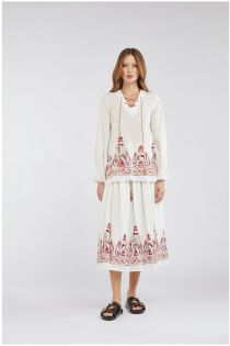 Cotton muslin blouse with embroidered detail at the hem. The neckline is decorated with a cord with tassels that creates a fine and sensual cross. Ruching trims the sleeves.