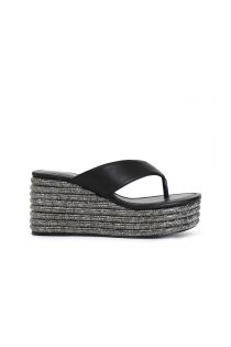 Napa leather flip-flops with wedge featuring rhinestone bands. the comfortable padded genuine leather insole makes the shoe comfortable even after several hours of use. the heel is 70mm high the platform is 35mm.