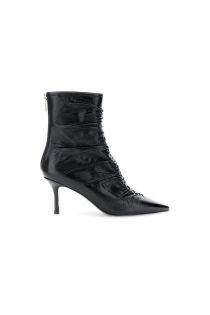 Naplak-effect leather ankle boots with ruching and a back zip. Bold pointed toe and 7.5 cm stiletto heel. Leather lining for ultimate comfort.