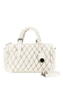 Nappa-effect satchel bag with embossed quilted finish, adjustable braided handles, and a logo charm. It features a removable shoulder strap for dual carry.