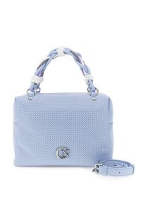 Nappa-effect handbag with micro-perforation featuring an elegant and modern design. mixed tubular handles a metal logo and a removable shoulder strap for a versatile everyday style. dimensions: 26 cm (length) × 18 cm (height) × 14.5 cm (depth)
