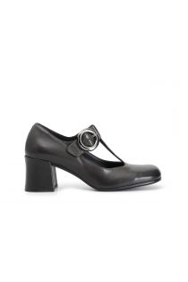 Women's shoe made of soft retro-style nappa leather with strap and large buckle. the toe and heel are squared. the insole is leather.