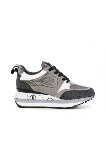 Nylon and suede sneakers with glitter and patent leather inserts. Elevated sole with brand name.