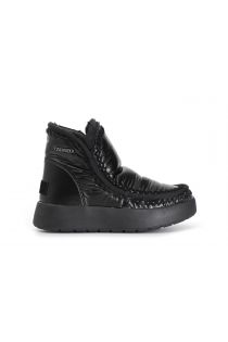 Women's nylon ankle boot with platform faux fur lining and metal logo on the leg.