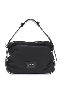 Sporty nylon bag with adjustable straps, buckles, and eyelets. The design is completed by a metal lettering plaque and functional details.