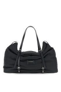 Soft, padded nylon shopping bag with a relaxed fit, featuring adjustable straps with buckles and eyelets. A front plaque with lettering adds an urban-chic touch.