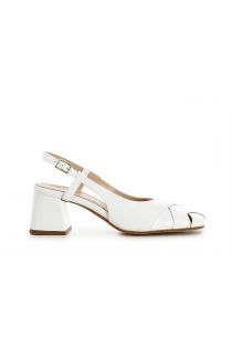 Open back patent leather shoes with woven upper. 5 cm leather-clad heel