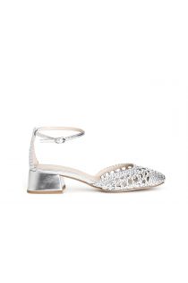 Open shank décolleté in woven laminate closed at the back with a patch and ankle strap. leather insole. shoe with a rounded shape. a mix between a moccasin and a pump. wide heel h. 4 cm. very comfortable perfect for everyday use.