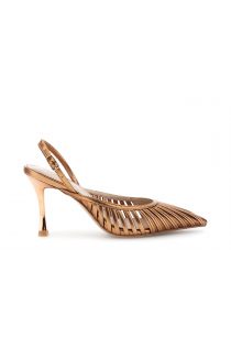 Elegant slingback pumps in a bronze or silver finish featuring a leather lining and insole a woven upper with thin straps and a pointed toe. the slender 8.5 cm heel lends a feminine touch making this shoe perfect for refined and striking looks.
