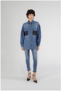 Oversized shirt with long sleeves and sequin appliqués on the pockets. made of chambrie denim canvas. closure with clip buttons. perfect to combine with a pair of jeans.