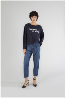 Oversized long-sleeved t-shirt made of cotton jersey. the graphics reproduce the writing "sapore di sole" with rhinestones.