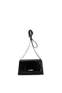 Shoulder bag with patent leather-effect flap. cross-body bag with removable contrasting chain and logo charms bag with one compartment and one zipped pocket. magnetic clasp.