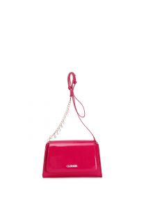 Shoulder bag with patent leather-effect flap. cross-body bag with removable contrasting chain and logo charms bag with one compartment and one zipped pocket. magnetic clasp.