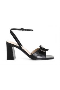 Patent leather sandals with ankle strap and adjustable buckle on the foot band. upper lining and insole are in leather. 8.5 cm high wide heel. elegant stylish and formal shoe.