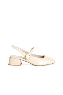 Patent leather slingback with button accessory. leather insole. shoe with a rounded shape. a mix between a moccasin and a pump. elastic strap on the back. wide heel h. 4 cm. very comfortable perfect for everyday use.