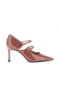 Patent pumps with an elegant and feminine style. shoe enriched with double strap and buckle. fine heel 87 mm high. slim shape. lining and insole are in leather.