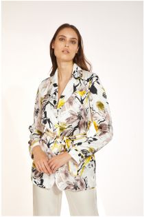 Patterned viscose satin soft, sinuous single-breasted jacket with sash at the waist