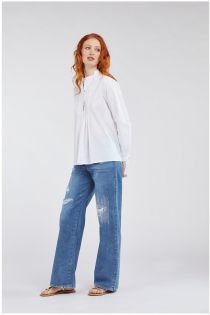 Cotton poplin kaftan-style shirt. A pattern of stitching and slight gathers create delicate movement.