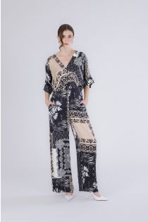 Women's long jumpsuit with a crossover neckline and elastic waist made of printed viscose satin. a flowing silhouette wide leg and elegant pattern for refined day and evening looks. the model is 171 cm tall and wears a size s. fit: regular.