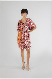 Knee-length dress with short wide sleeves. fabric sash at the waist. made of viscose satin with exclusive scarf print available in two color variations. a garment suitable for day and evening.