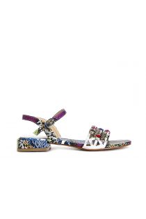 Die-cut sandals with coloured lizard effect rhinestones. comfortable padded insole for a soft fit. 20mm high heel. comfortable to wear and easy to pair with outfits.