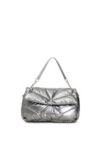 Soft, metallic-effect nylon shoulder bag with irregular quilting and hexagonal studs to be worn over the shoulder with a chain